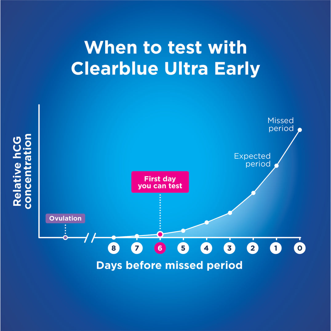 Can test 6 days early When you want to know if youre pregnant waiting to test can be hard. Thats why Clearblue Ultra Early Pregnancy Test can be used up to 6 days before your missed period, which is 5 days before the day you would expect your period to start (your expected period). Over 99% Accurate.