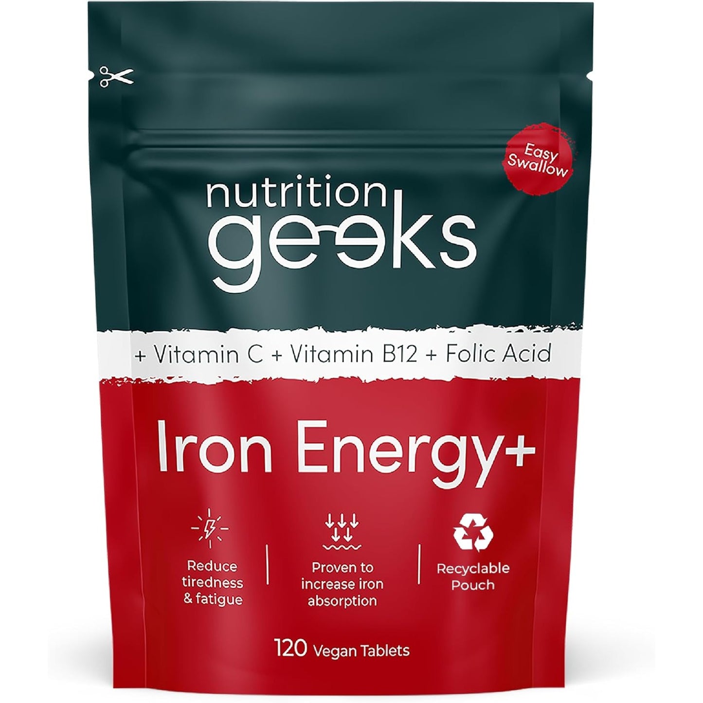 WHY BUY NUTRITION GEEKS' IRON ENERGY+? Each pouch contains 120 Iron Energy+ tablets (4 months supply), specially formulated to provide 14mg of Iron, Vitamin B12, Vitamin C and Folic Acid per tablet. These Iron Supplements aid the reduction of tiredness and fatigue. Other benefits include supporting the immune system, formation of red blood cells and oxygen transport around the body. The addition of Vitamin C increases iron absorption in the body.