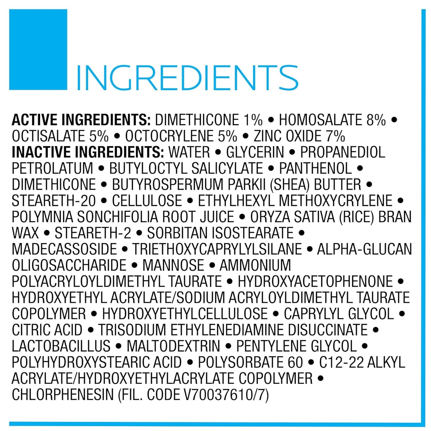 Aqua/Water • Homosalate • Panthenol • Ethylhexyl Salicylate • Butyl Methoxydibenzoylmethane • Octocrylene • Alcohol Denat. • Bis-Ethylhexyloxyphenol Methoxyphenyl Triazine • Styrene/Acrylates Copolymer • Ethylhexyl Triazone • Triethanolamine • Dimethicone • Phenylbenzimidazole Sulfonic Acid • Peg-8 Laurate • Sorbitan Oleate • Zinc Gluconate • Madecassoside • Manganese Gluconate • Isohexadecane • Sodium Acrylates Crosspolymer-2 • Silica • 2-Oleamido-1 • 3-Octadecanediol • Perlite • Drometrizole Trisiloxane • Poloxamer 338 • Disodium Edta • Copper Gluconate • Caprylyl Glycol • Polysorbate 80 • Acrylamide/Sodium Acryloyldimethyltaurate Copolymer • Acrylates/C10-30 Alkyl Acrylate Crosspolymer • Bht • Tocopherol • Phenoxyethanol