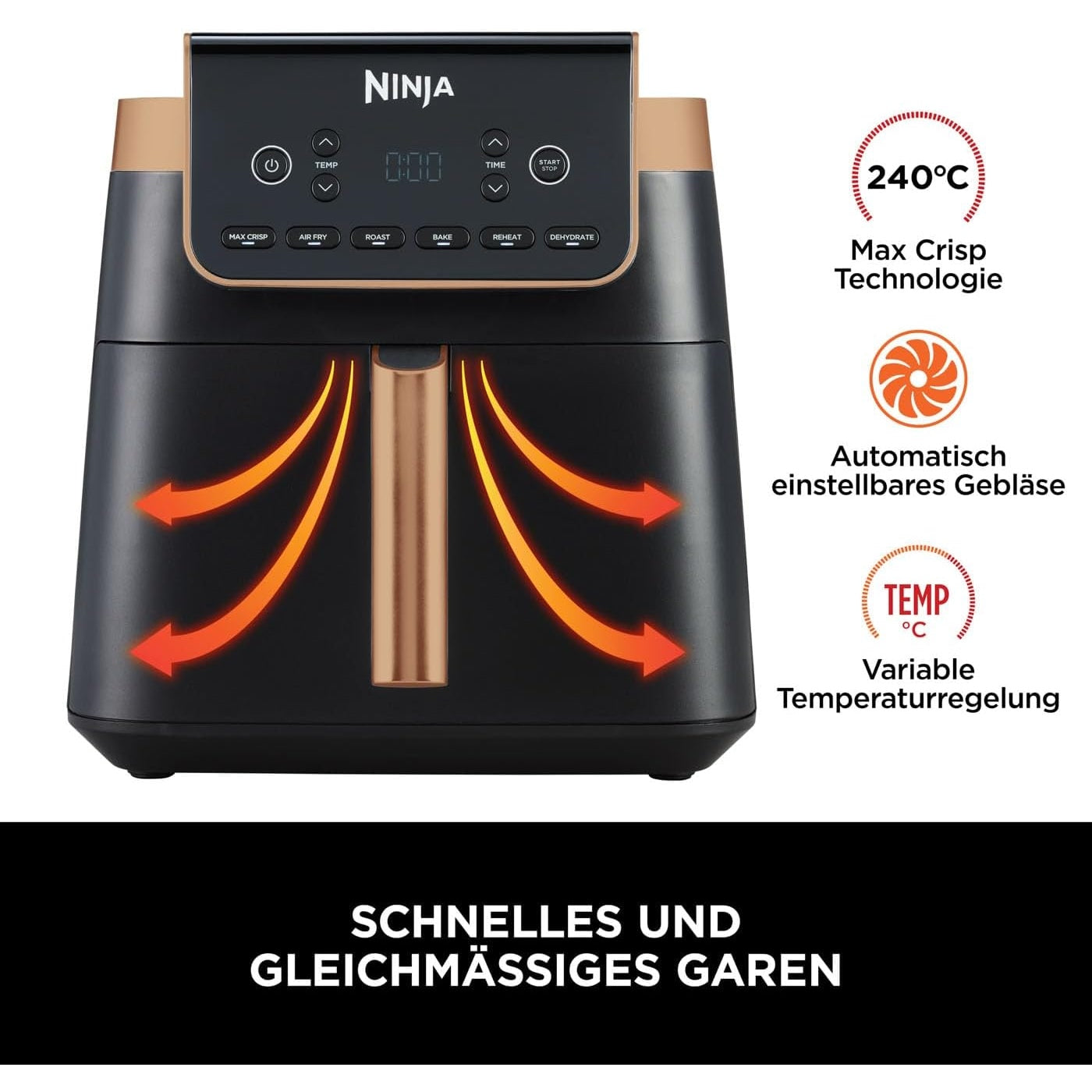 INCLUDED: Ninja Airfryer Single Drawer (EU Plug) Non-stick, Dishwasher Safe 6.2L Basket & Adjustable Crisper Plate, Silicone Tongs. Chef Curated Recipe Guide. Color: Black/Copper