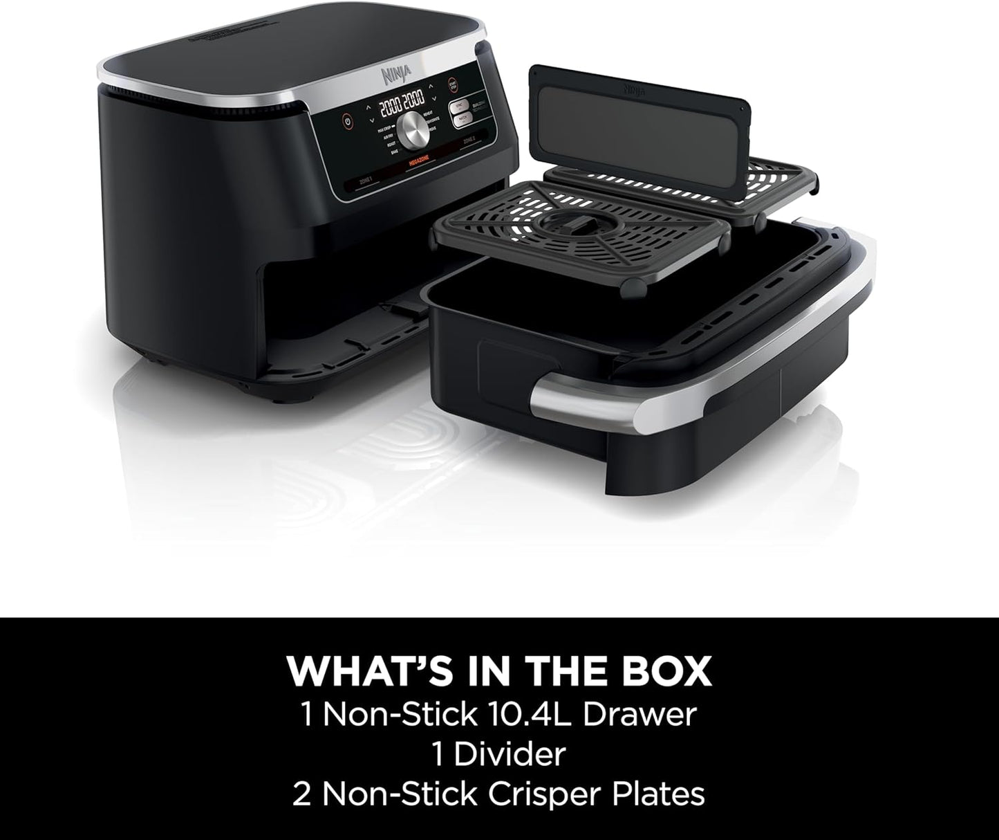 - INCLUDES: Ninja FlexDrawer Air Fryer, Non-stick, dishwasher safe 10.4L drawer, divider & 2x crisper plates, Chef-created Recipe Guide. Weight: 9.3kg. Colour: Black