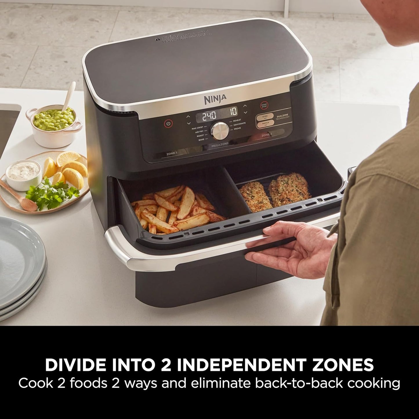 - FLEXDRAWER ADAPTS TO FIT EVERY MEAL: Remove the divider to transform 2 independent cooking zones into 1 extra-large 10.4L MegaZone to cook larger foods, traybakes & complete meals. Feeds 8+ people.